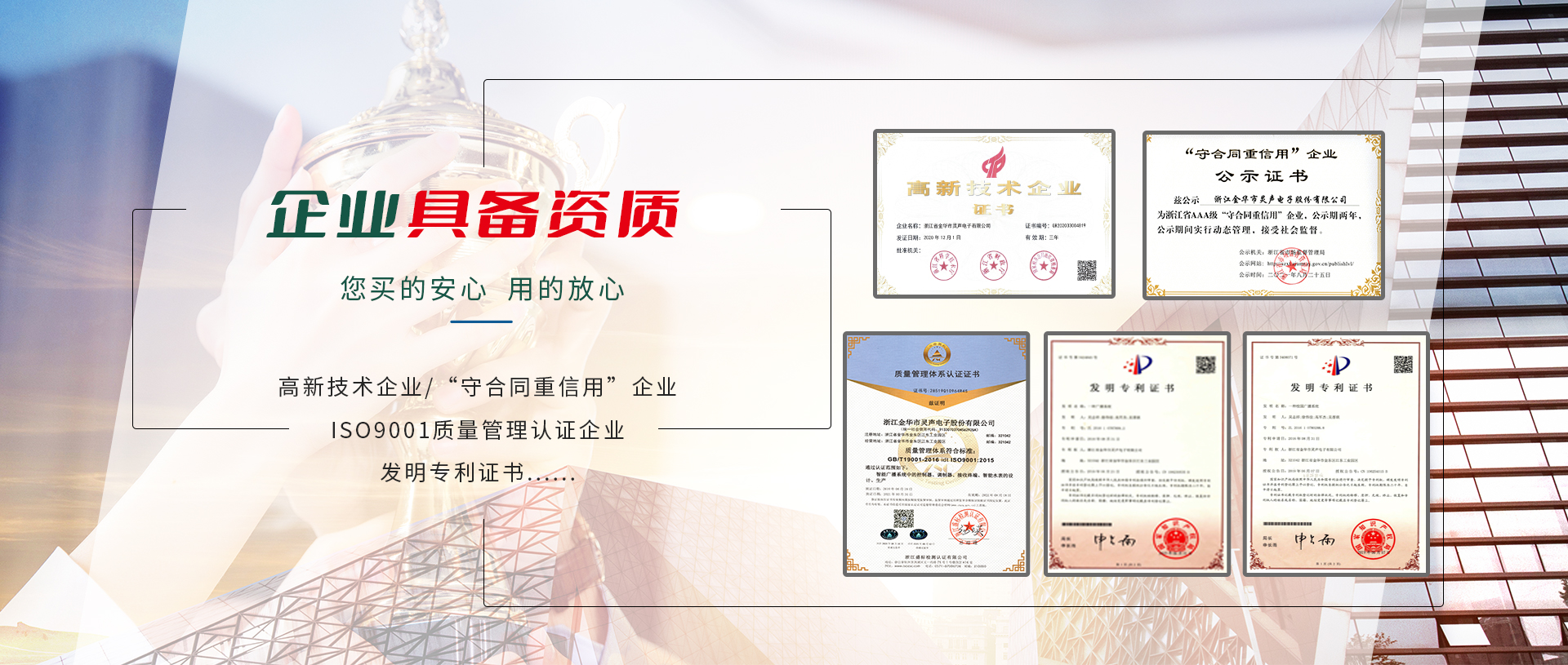 公司2001年通過ISO9001:2008國際質量管理體系認證、ISO14001:2004環(huán)境管理體系認證,相關產品通過國家CCC認證及CQC產品質量認證,并通過國家廣播電影電視新聞出版總局廣播電視設備器材入網認可。公司注重產品的質量與技術創(chuàng)新,現建有多條先進的總裝、檢測流水生產線及各項檢測設備所需的儀器設備。還擁有全電磁屏蔽室一個,所有高頻產品的調試均在屏蔽室中進行。公司組建了高素質的管理隊伍,設有研發(fā)部、生產部、銷售部、采購部、質檢部、售后服務中心及財務部等部分,并與國內多家大專院校、科研單位建立長期合作關系,成立了近乎是技術研發(fā)中心,是金華市職業(yè)技術學院重點示范實習基地。公司產品先后被浙江、江蘇、重慶、四川、甘肅、山東、湖南、湖北、貴州等文廣新局、電視臺、氣象局普遍采用,覆蓋全國各省市800多家縣(市)文廣新局、廣播電視臺,并廣泛采用于教育行業(yè),尤其是在近年來的農村應急廣播“村村響”工程中,靈聲公司中標承建的“村村響”工程贏得了各省市廣播電視劇領導、專家們的一致好評!